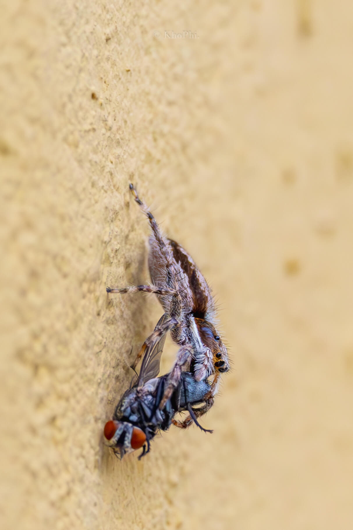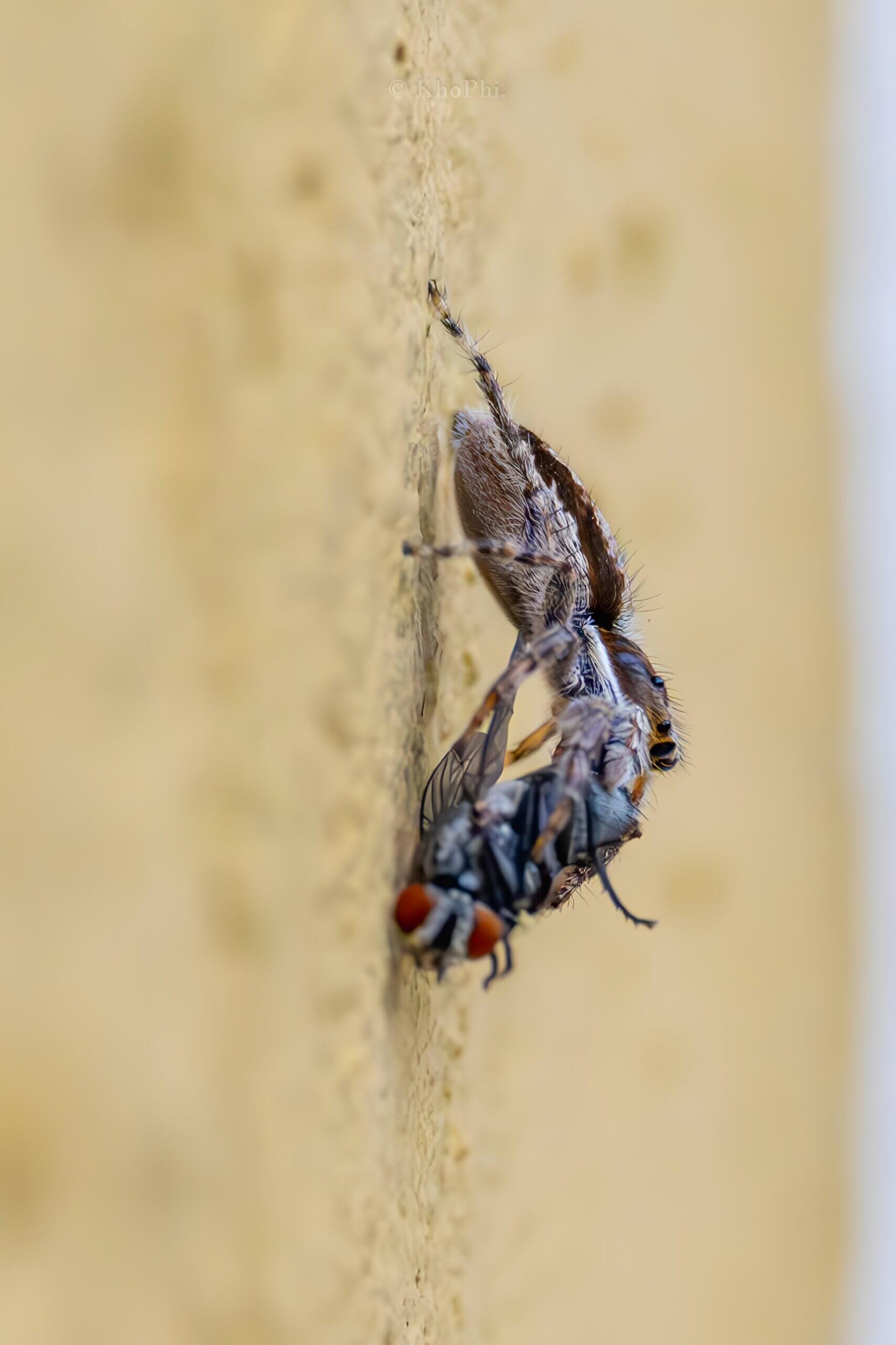 Wall Jumper Spider munches on a Fly