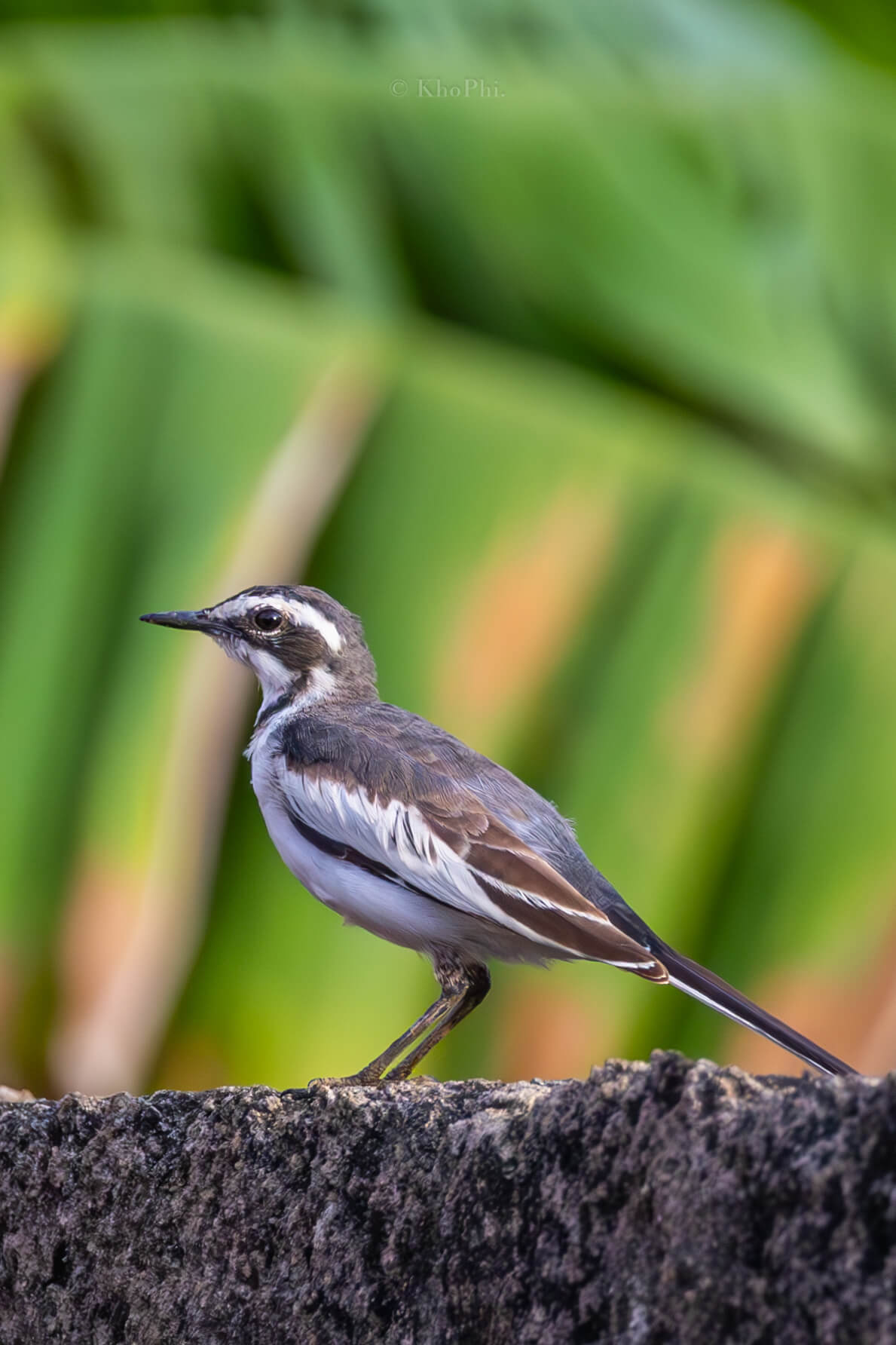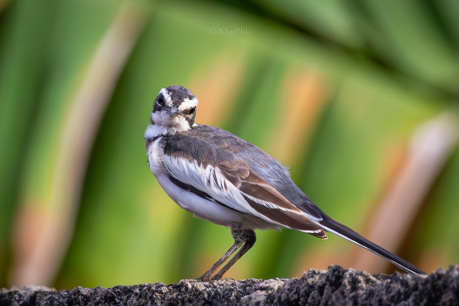 This metal glossy print captures a close-up of a small bird, possibly an African pied wagtail (Motacilla aguimp) perched on a smooth, gray rock. The bird has a long tail that it constantly wags up and down. This behavior is thought to help the bird to startle insects and to flush them out of hiding, making them easier to catch.